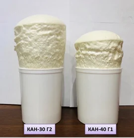 На рис.1 представлены образцы напыляемого ППУ с плотностью 8–20 кг/м3, компоненты применяются для изоляции межэтажных перекрытий. Дают коэффициент теплопроводности 0,035–0,040 ВТ/м°C. При меньшей плотности количество открытых ячеек увеличивается, ячейки повышают обмен газов с окружающей средой.